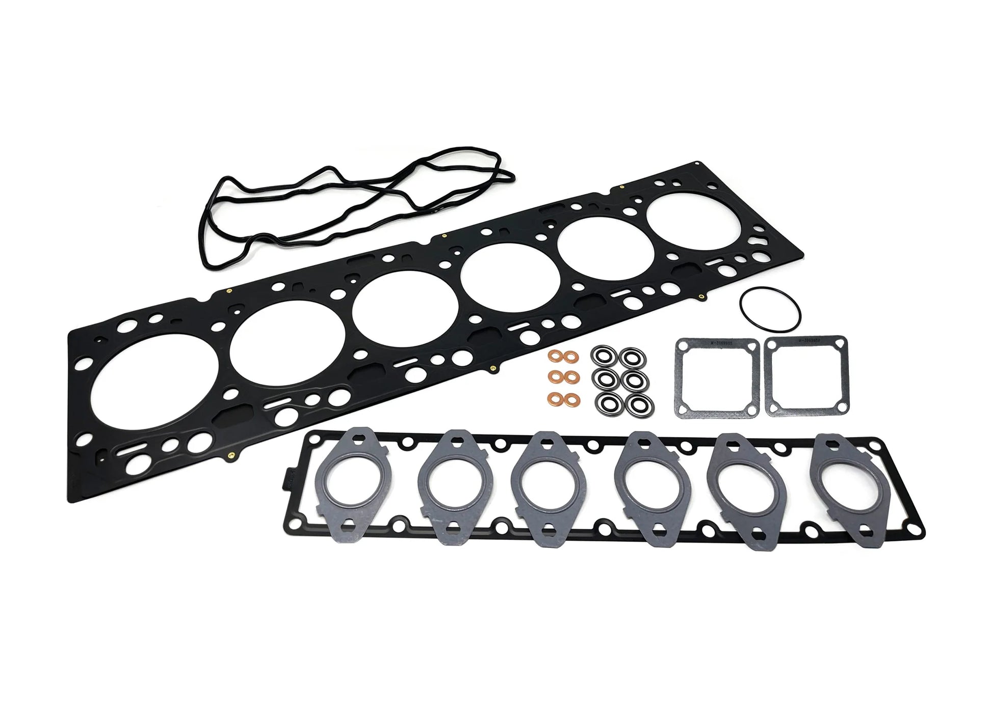 Use only the best with our D&J Cummins Head Gasket kit 2007-2007 5.9 Common Rail. Includes genuine Cummins head gasket, exhaust manifold gaskets, long intake gasket air horn gasket, injector install kit with cross tube o-ring, rocker box gasket, and thermostat gasket.